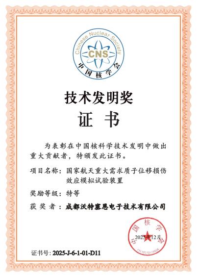 近日,成都沃特塞恩电子有限公司(以下简称“沃特塞恩”)荣获由中国核学会颁发的中国核科学技术发明奖特等奖证书。