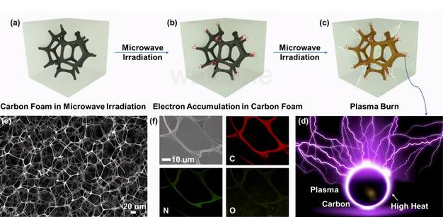 图丨微波辐射过程中碳泡沫产生的等离子体点火和热量的示意图(来源:Environmental Science & Technology)