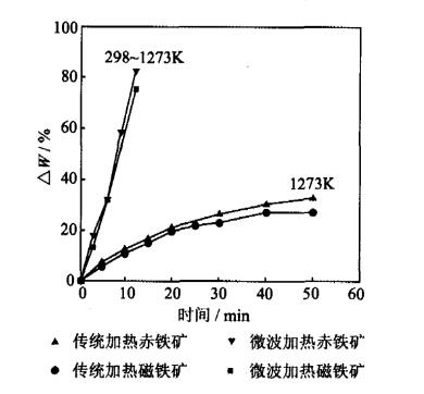 N.Standish等人做了微波加热还原对比试验。将赤铁矿粉与焦粉和石灰粉按一定比例混合,然后放入坩埚并用手压实,分别进行微波加热和传统加热。传统加热是在马弗炉中进行的,温度为1273K。微波加热的频率是2.45GHz,功率为1.3kW,反应温度达1273K停止。用热重法测定加热还原过程中物质的失重量。实验表明,微波加热还原的反应速率比传统加热还原的反应速率快的多,微波加热与传统加热对比见下图。