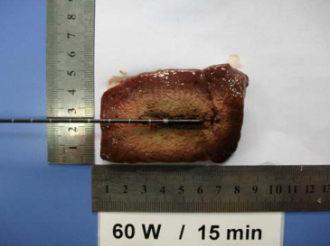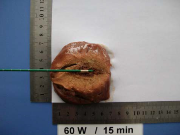 上图为新一代的高效水冷 2450 MHz微波消融辐射器离体猪肝消融效果。(60W/15M,短轴 4.5 厘米,长轴 5.5 厘米)