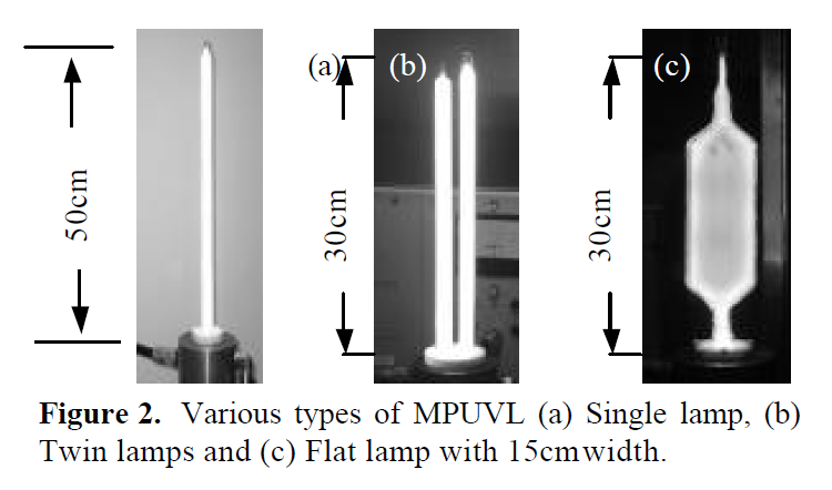 目前技术提供的是基于电场在灯的两边由两个电极支撑的紫外灯(有极灯)。这种技术有实际的局限性,如降低灯具的效率并限制它们纵向输出紫外辐射功率等。微波紫外灯不使用任何电极,他被连接到一个TE010传播模式、长度为100mm谐振腔,如Figure 1.所示。MPUVL(微波等离子体无极灯)无论是在直流或脉冲模式下都可以运行,也可以制作成任何形状和长度,如Figure 2.所示。